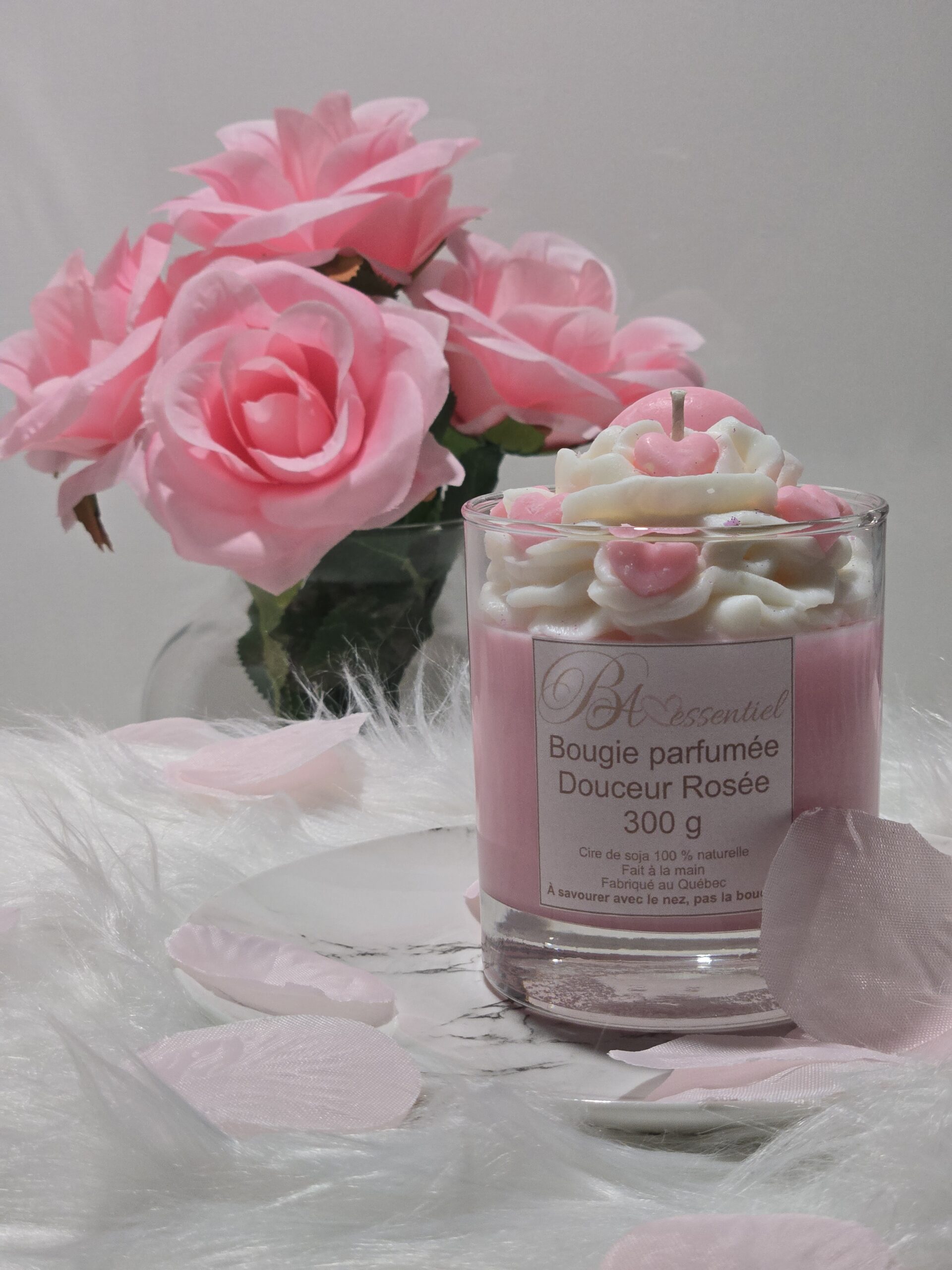 Our Douceur Rosée candle, handmade in an elegant glass jar, diffuses a delicately sweet scent of pink sugar reminiscent of the sweetness of candy and childhood memories.